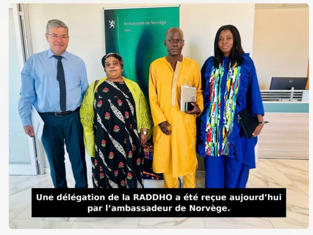 Une délégation de la RADDHO conduite par la directrice des projets et programmes a été reçue le vendredi 27 mars 2026 par son Excellence  Knut LANGELAND Ambassadeur de la Norvège au Sénégal. A l’entame de ses propos, le diplomate,  après avoir remercié la RADDHO de cette visite a voulu en savoir plus sur les relations entre que l’organisation entretient avec les autorités publiques du Sénégal. Il a ensuite donné la parole à la cheffe de délégation. Cette dernière a fait une brève présentation de notre organisation des droits de l’homme. A sa suite, les échanges ont porté sur l’actualité du Sénégal. Il s’agit entre autres de la modification de l’article 319 du code pénal portant sur le durcissement des peines relatives aux actes contre nature qui passent de 5 à 10 ans, les questions de la liberté d’expression, la démocratie, les droits de l’homme, la restriction des libertés dans l’espace civique. L’Ambassadeur a interrogé la délégation sur le monitoring en matière de droits de l’homme que la RADDHO fait au niveau du Comité des droits de l’homme concernant les cycles de l’Examen Périodique Universelle surtout dans le cadre du passage de la république du Niger dans cette instance des Nations Unies. D’autres thématiques ont été abordées comme la résilience démocratique et la protection des droits de l’homme au Sahel Central, la sécurité humaine en Afrique de l’Ouest. La Délégation de la RADDHO a donné des réponses sur les préparatifs de l’élaboration du rapport du Sénégal au Comité des Droits de l’homme à Genève et sur l’assistance juridique et judiciaire de certains journalistes durant l’année 2025-2026 avec Avocat Sans Frontière de Canada. La délégation a aussi apporté une clarification sur sa position en dénonçant la violation des secrets médicaux des personnes supposées faire la propagation du VIH et le SIDA qui sont en détention provisoire. Durant cette rencontre de travail, la Directrice des Programmes de la RADDHO a communiqué sur le travail de l’organisation dans le renforcement de la capacité des acteurs de la société de l’Afrique de l’Ouest et le parcours dans la promotion et la protection des droits de l’homme au Sénégal et en Afrique